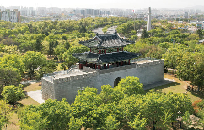 대구에는 식민지 근대의 흔적을 느낄 수 있는 곳들이 많다. 남아있는 그 시절의 공간도 있지만, 사라진 것을 복원한 곳들도 있다. 대구읍성의 남문이었다가 망우당공원 언덕 위에 복원한 ‘영남제일문’도 그런 곳이다. 대구 군수 겸 경북 관찰사 서리였던 친일파 박중양에 의해 헐린 영남제일문은 사라진 지 73년만인 1980년 망우당공원 언덕에 다시 지어졌다. 본디 있던 자리도 아니고, 건물의 형태와 크기도 달라 복원이라기보다는 상징처럼 지어진 곳인데 여기에 오르면 대구 동구와 수성구 일대가 한눈에 들어온다.